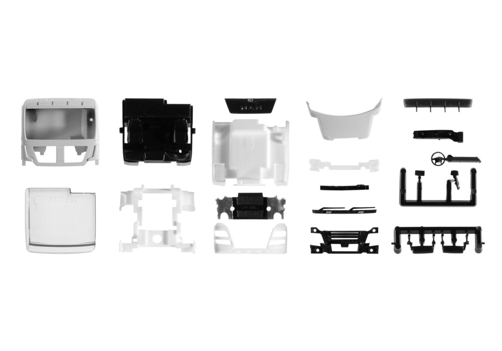 Stavebnice kabiny MANu TGX XL Euro 6c se spojlerem,s bočními kryty v bílé barvě,s černými doplňky.