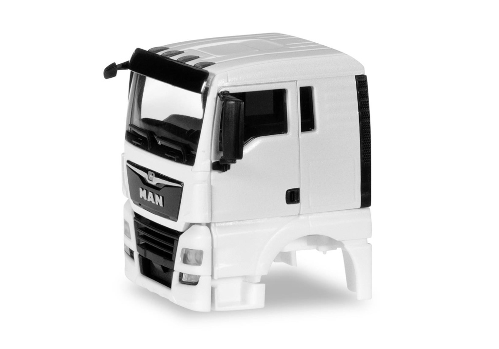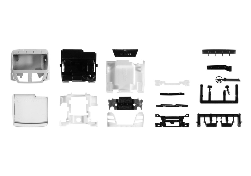 Stavebnice kabiny MANu TGX XL Euro 6c bez spojleru a bez bočních krytů v bílé barvě,s černými doplňky.