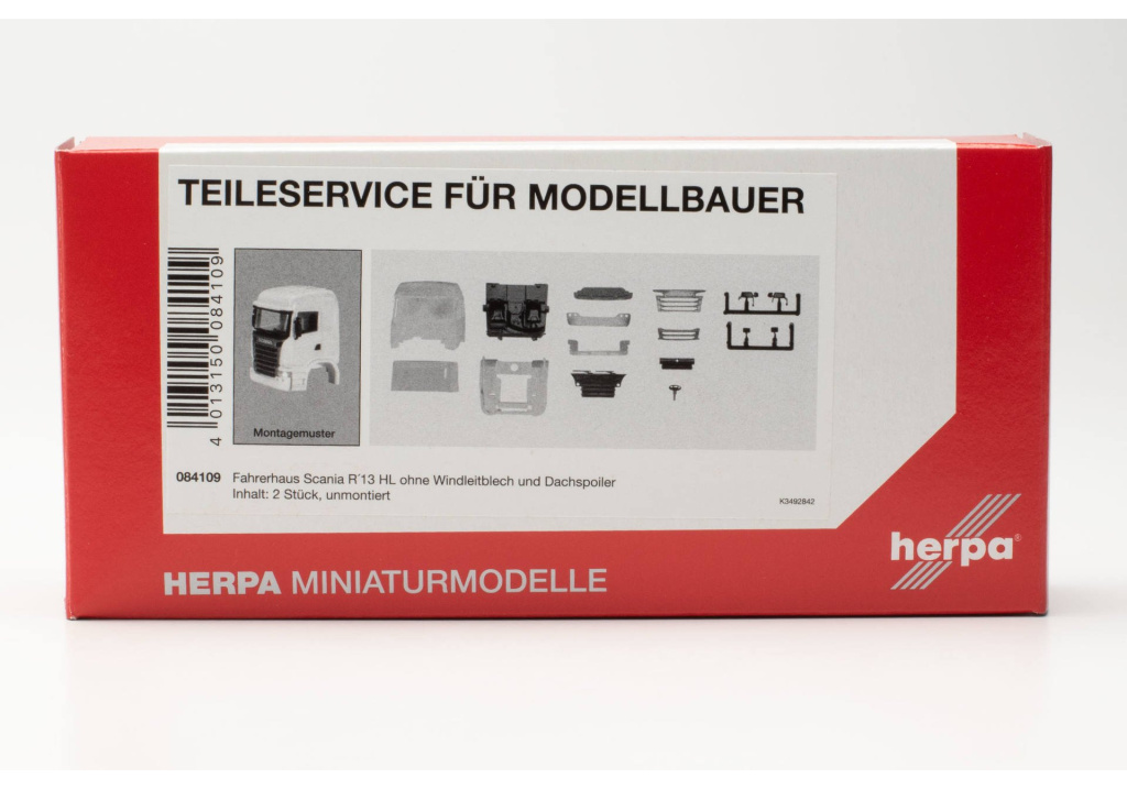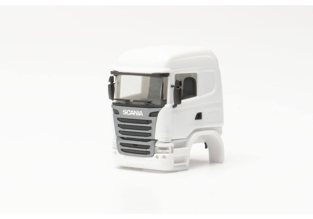 Stavebnice modelu kabiny Scanie HL 2013 v bílé barvě,bez střešního spojlerem,bez bočních krytů za kabinou/uši a bez krytu na šasí. Kabina,spodní díl kabiny,nárazník v bílé barvě,stříbrná maska , ostatní doplňky jsou černé.