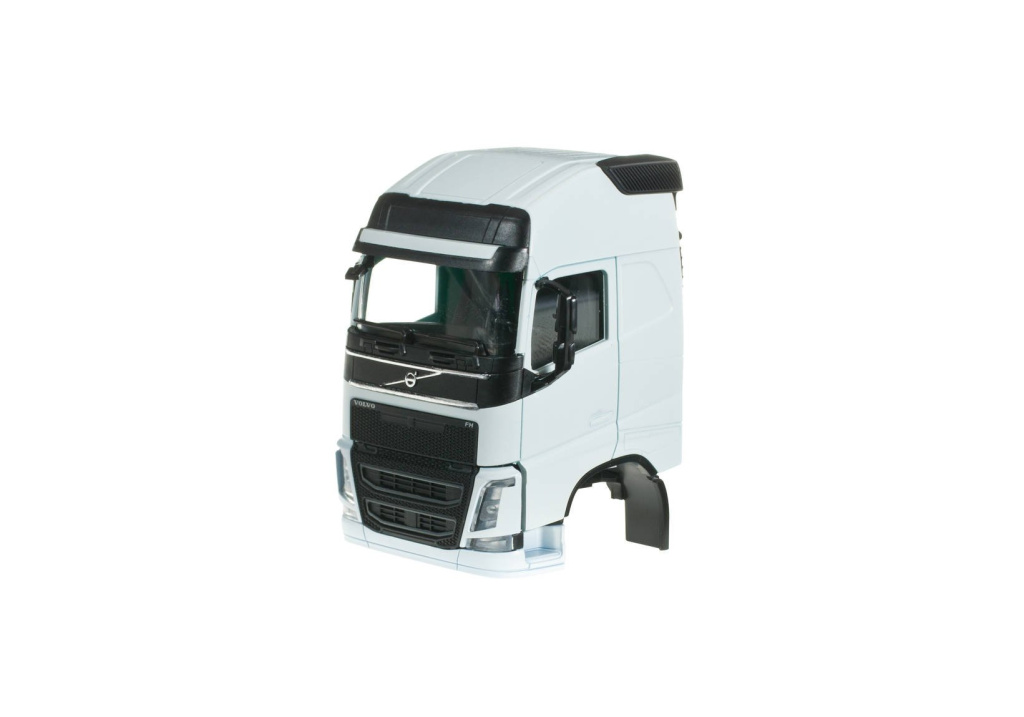 Stavebnice kabiny Volvo FH GL XL2013 bez střešního spojleru,bez bočních krytů za kabinou/uši/,se sluneční clonou.Kabina,spodní díl kabiny,nárazník a kryt na šasí je v bílé barvě, černá maska s chromovanými prvky , ostatní doplňky jsou černé.