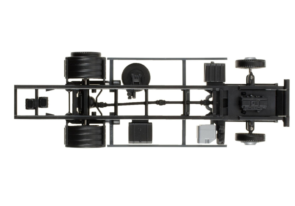 Stavebnice podvozku pro dvounápravový nákladní automobil MAN TGL 7,5 t s nástavbou s hydraulickým zadním čelem.Podvozek je v černé barvě se stříbrnými doplňky.