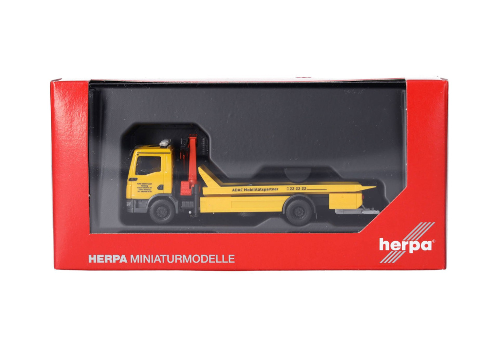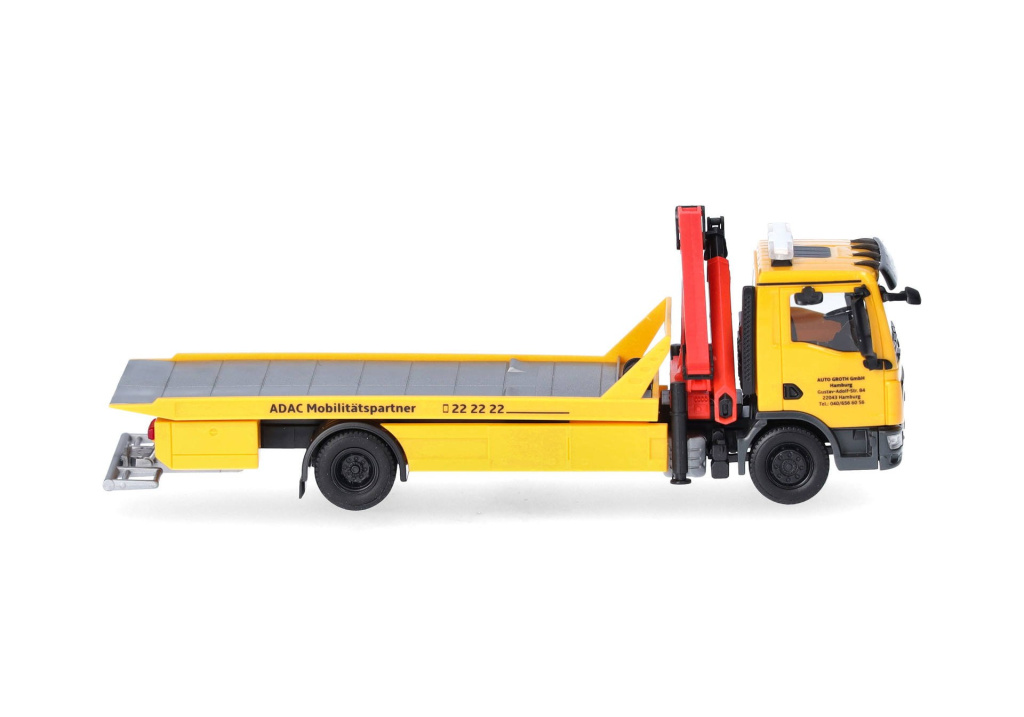 Model dvounápravového nákladního automobilu MAN TGM s nástavbou pro odtah a přepravu vozidel,s hydraulickou rukou za kabinou,ve žluté barvě společnosti ADAC/Auto Groth