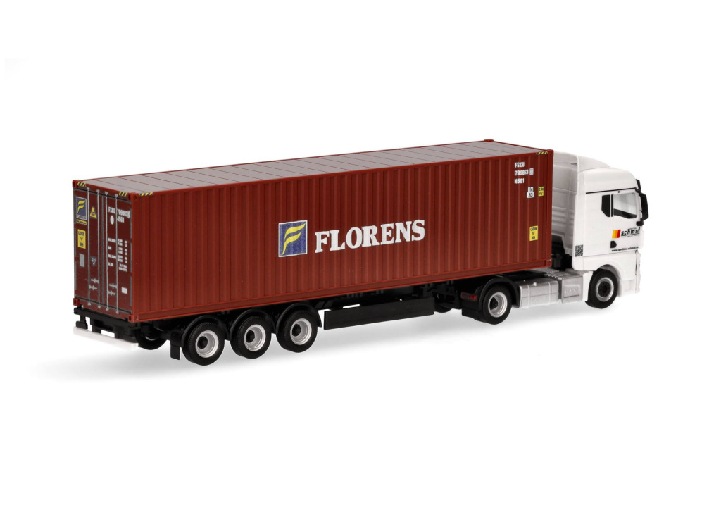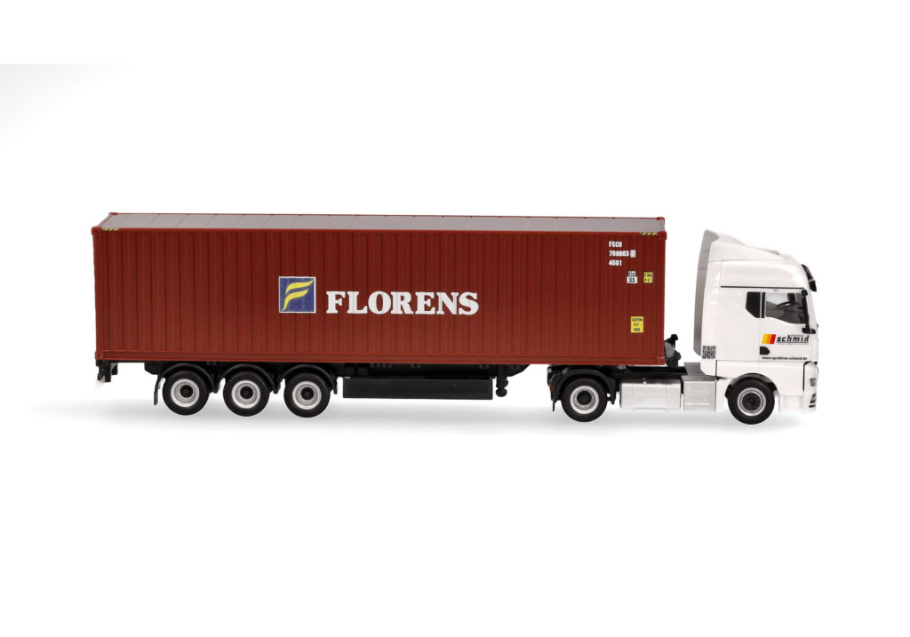 Model dvounápravového tahače MAN TGX GM s třínápravovým návěsem dopravní společnosti Schmid s naloženým kontejnerem 40 ft. společnosti Florens.