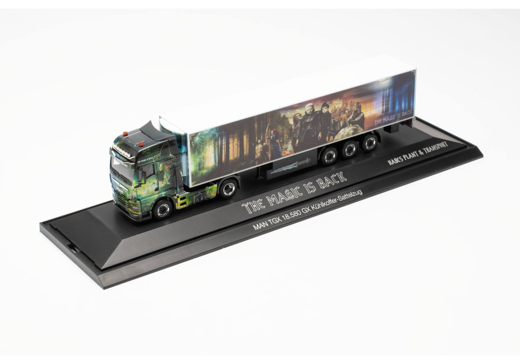 Model dvounápravového tahače MAN TGX GX s třínápravovým chladírenským návěsem nizozemské společnosti Habes Plant & Transport.Simon Habes navrhl tuto soupravu tak, aby odpovídala filmovým scénám a postavám filmu The Magic is Back.Společnost má sídlo v Goudě v Nizozemsku.Model je umístěn v plastové vitríně na černém podstavci.