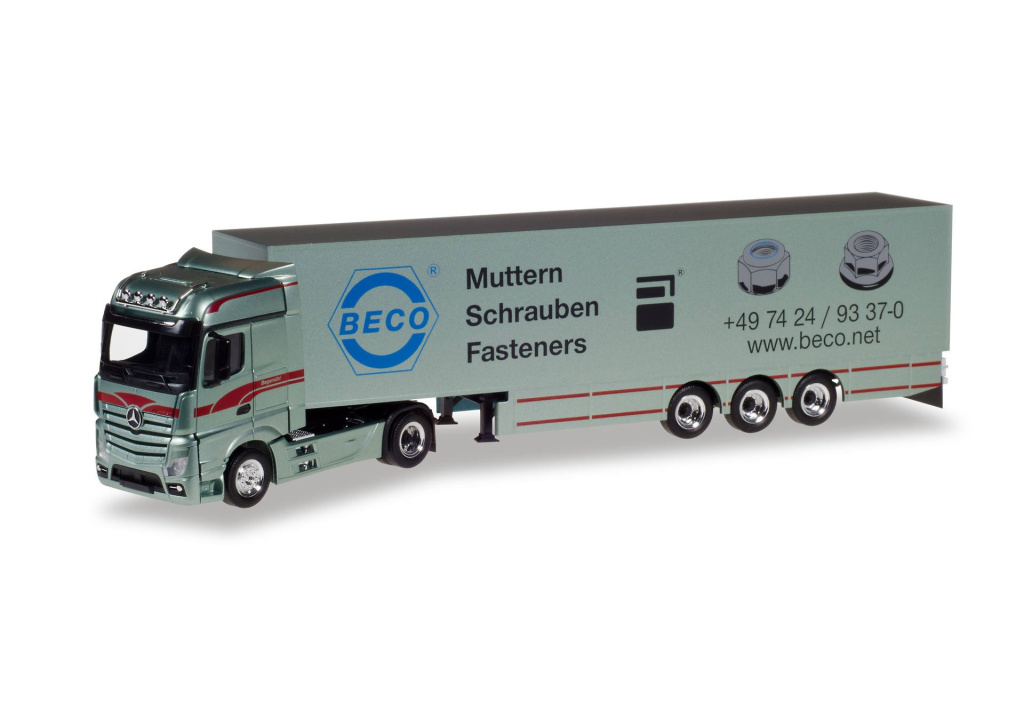 Model dvounápravového tahače Mercedes-Benz Actros Bigspace  s třínápravovým skříňovým návěsem dopravní splečnosti Bagemühl.