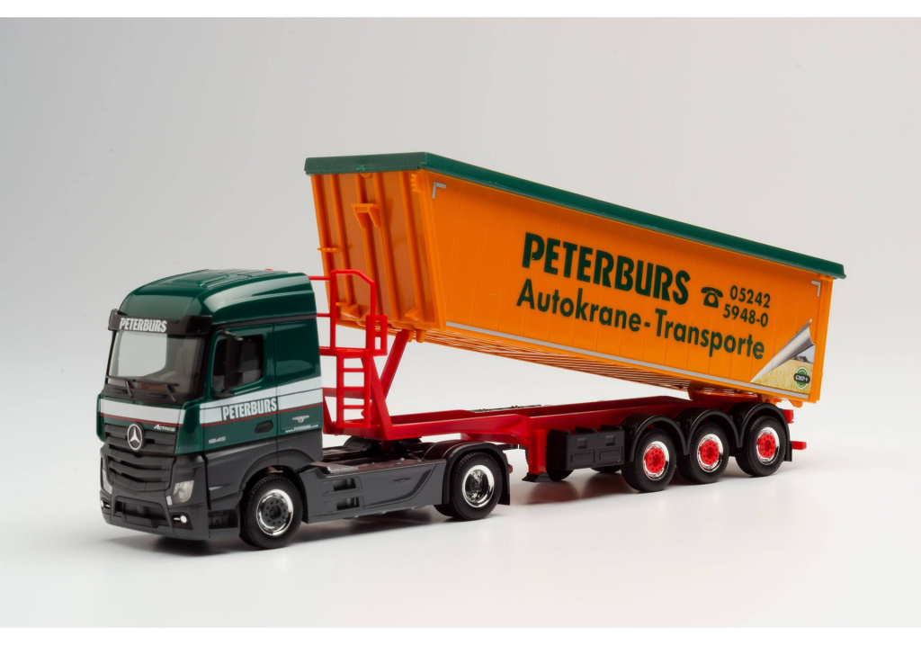 Model dvounápravového tahače Mercedes-Benz Actros Streamspace 2.5 s třínápravovým velkoobjemovým sklápěcím návěsem  v barvách dopravní společnosti Peterburs.