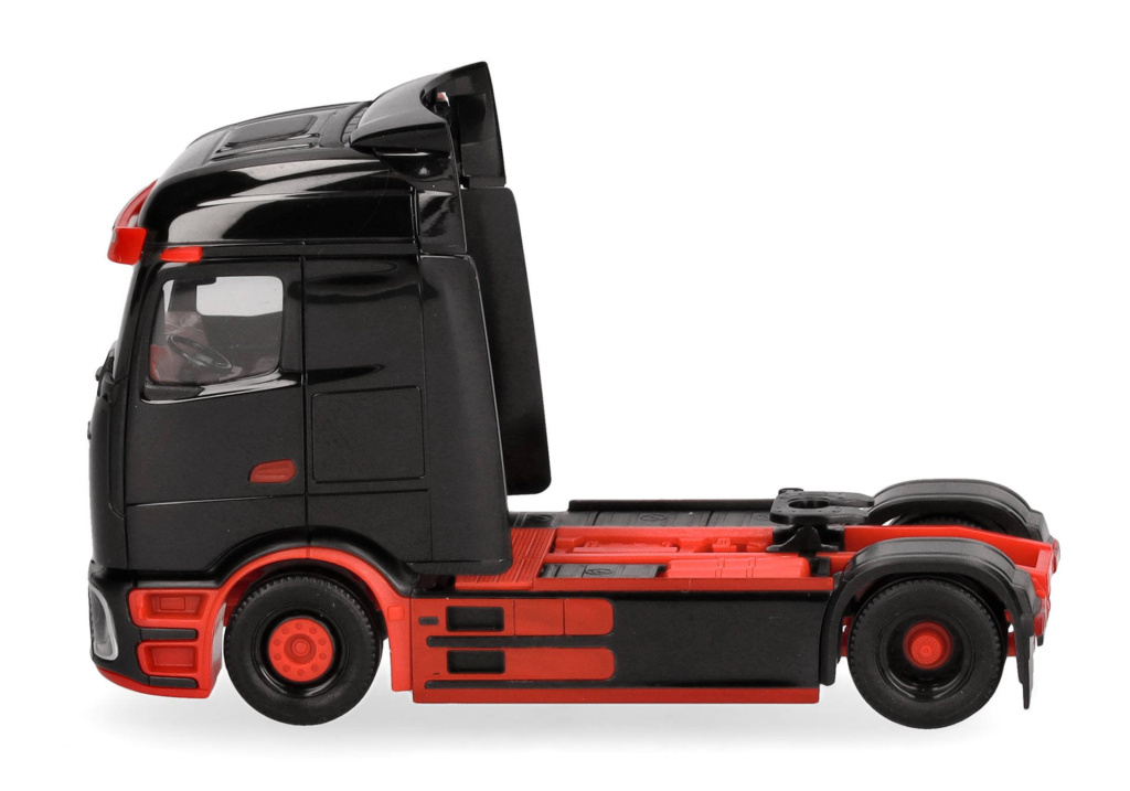 Model dvounápravového plně elektrického tahače Mercedes-Benz eActros 600 ProCabin s černou kabinou a červenými doplňky.
