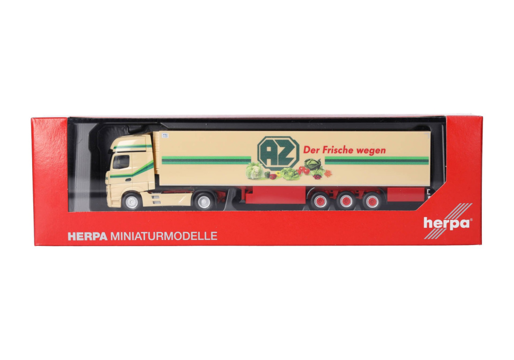 Model dvounápravového tahače Mercedes-Benz Actros L 18 Gigaspace s třínápravovým chladírenským návěsem v barvách dopravní firmy AZ Kempen ze Straelenu na Dolním Rýnu .