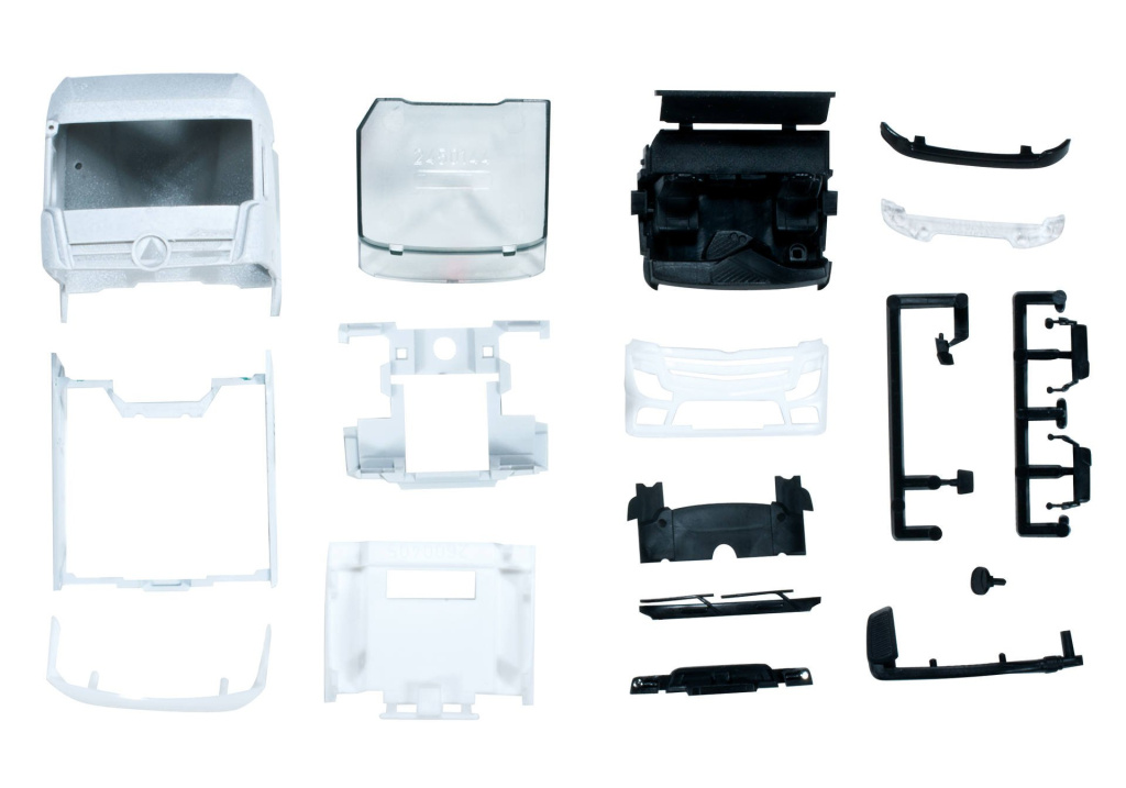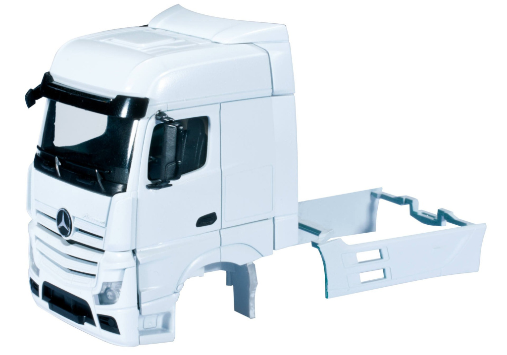 Stavebnice kabiny Mercedes Benz Actros 2011 v provedení Bigspace/střední/ s malým střešním spojlerem,s bočními kryty za kabinou/uši/,se sluneční clonou a krytem na šasí.Kabina a kryt na šasí je v bílé barvě,ostatní doplňky černé.