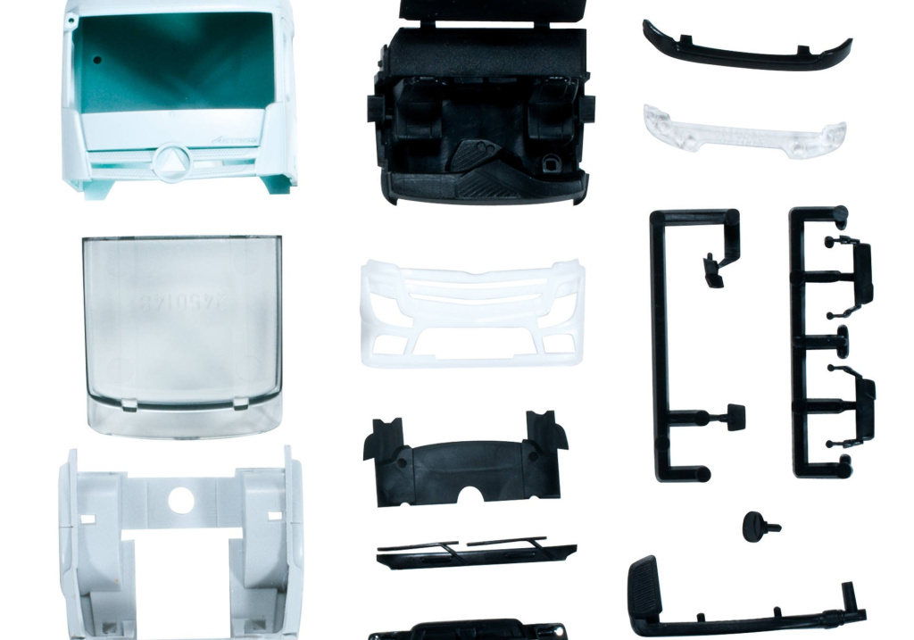 Stavebnice kabiny Mercedes Benz Actros 2011 v provedení Streamspace/nízká/ bez střešního spojleru,bez bočních krytů za kabinou/uši/,se sluneční clonou a bez krytu na šasí.Kabina je v bílé barvě,ostatní doplňky černé.