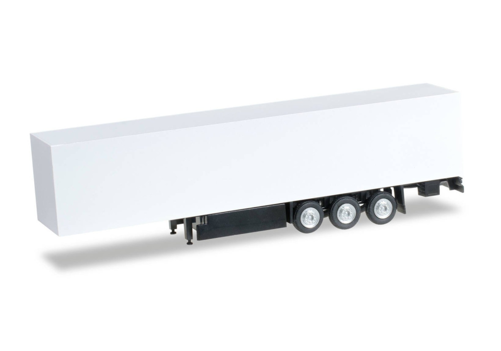 Stavebnice třínápravového skříňového návěsu bílé barvě,s černým podvozkem a stříbrnými doplňky.