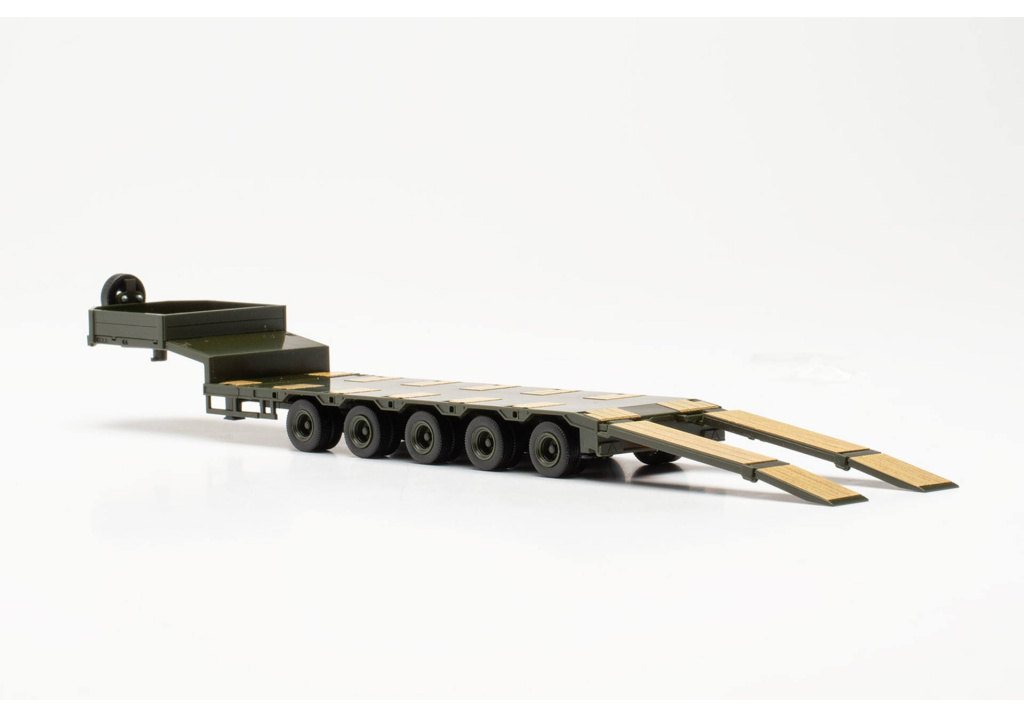 Model pětinápravového nízkého návěsového podvalníku Goldhofer s nájezdovými můstky v zelené vojenské barvě.