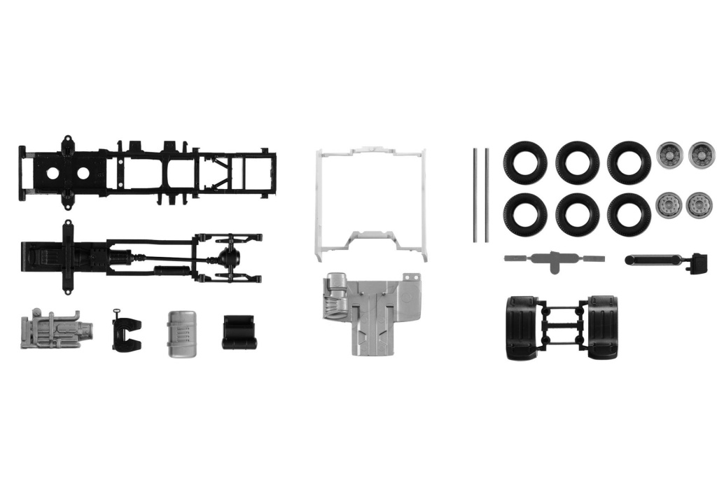 Stavebnice podvozku pro dvounápravový tahač DAF XF Euro 6 s mezinápravovými kryty.