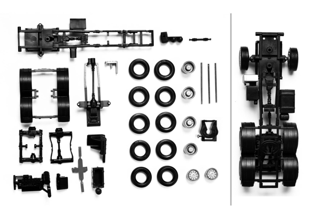Stavebnice podvozku třínápravového tahače Man s pohonem 6x6,Jedno balení obsahuje 2 kusy podvozků.