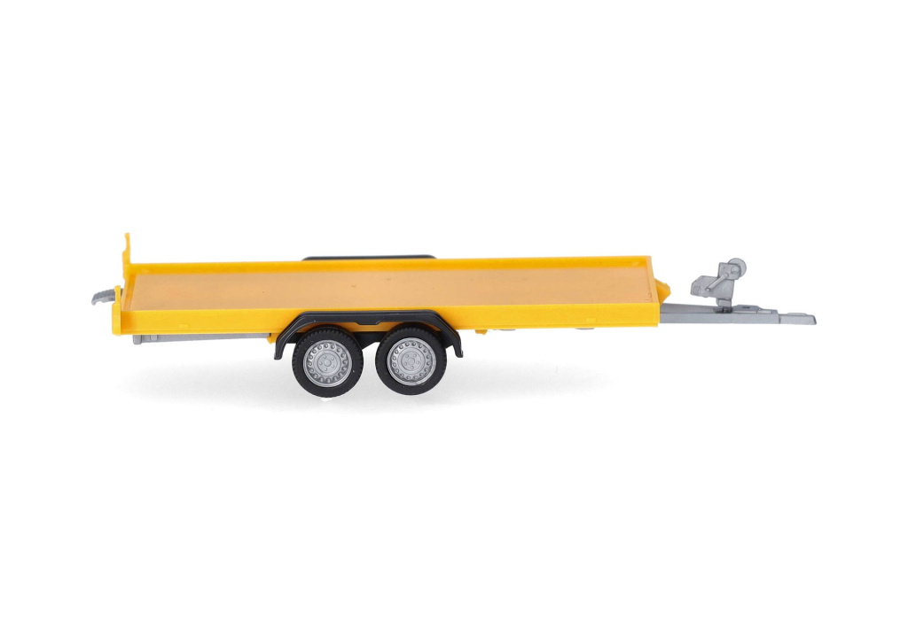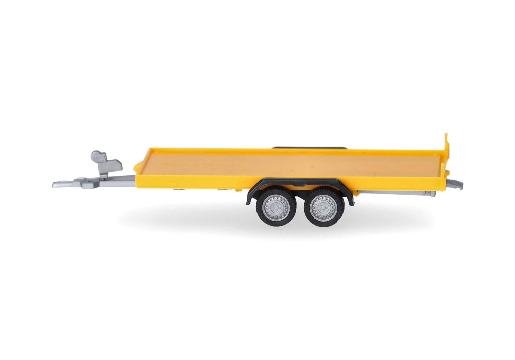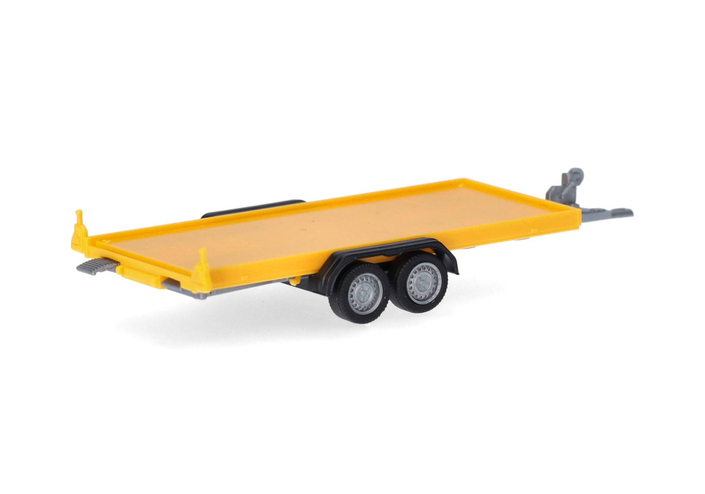 Dvounápravový přívěs na přepravu aut za osobní a dodávkové automobily ve žluté barvě se stříbrným rámem.