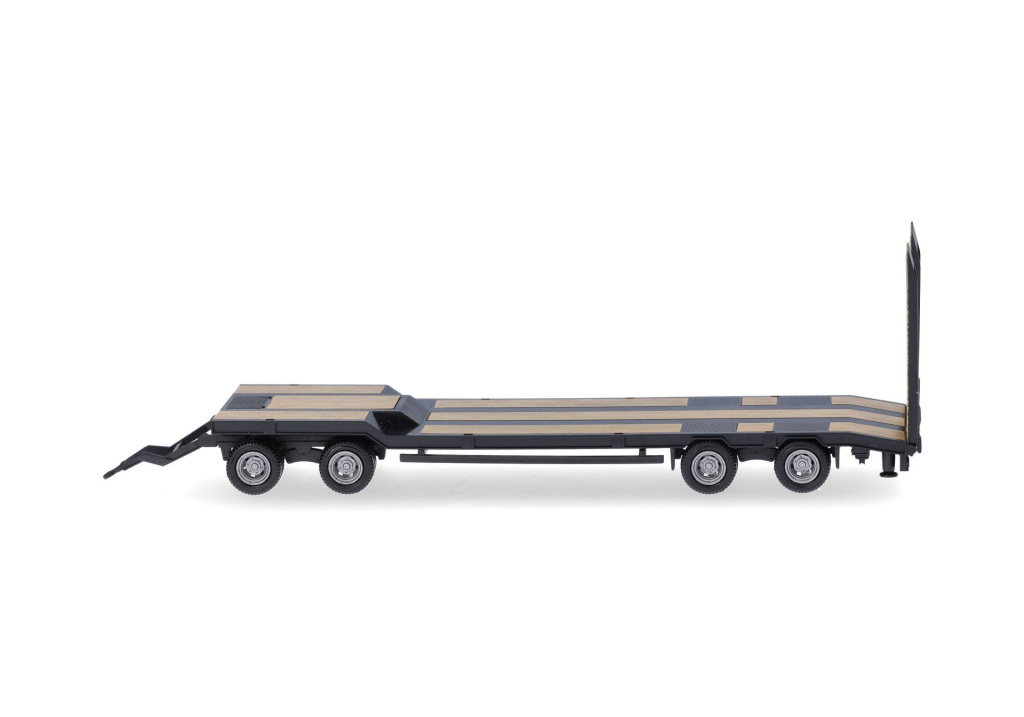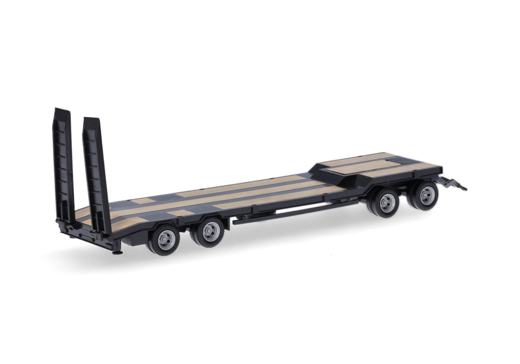 Model čtyřnápravového plošinového přívěsu TU4 s nájezdovými můstky určeného především k přepravě stavebních strojů,v černé barvě.