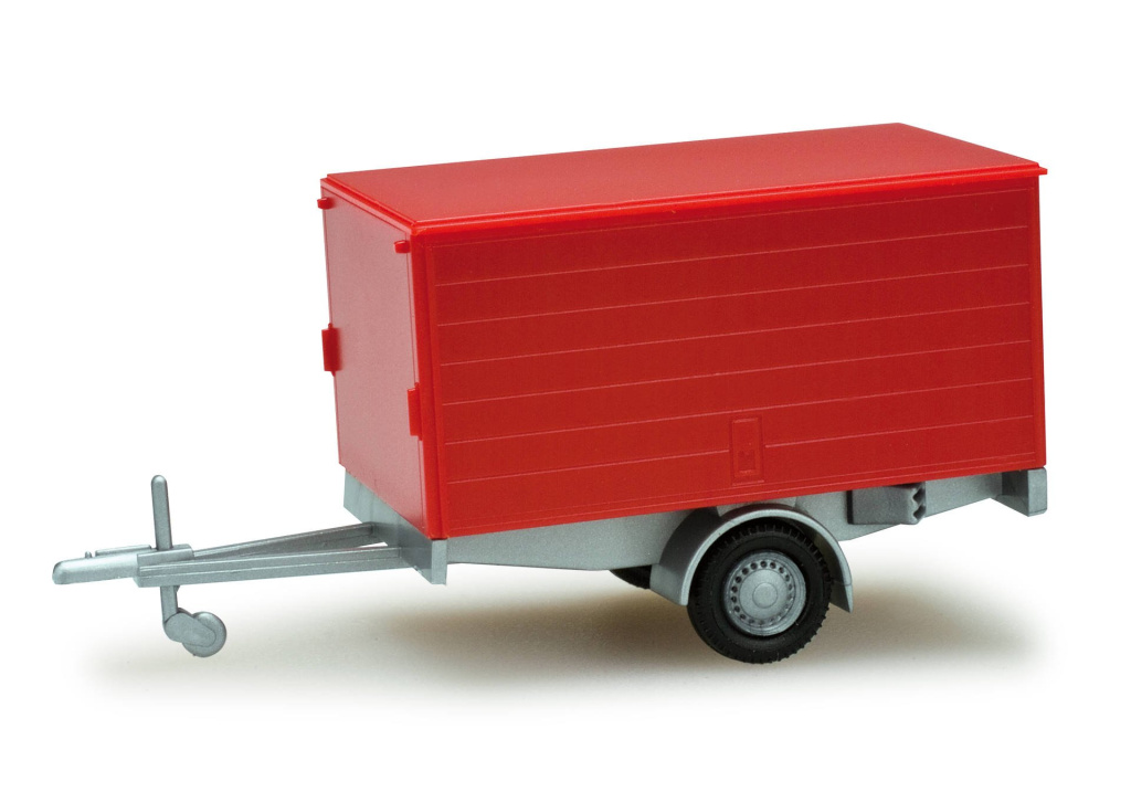 Jednoosý přívěs za osobní a dodavkové automobily se stříbrným podvozkem a uzavřenou skříňovou nástavbou v červené barvě.Různé typy tažného zařízení pro dodávky a osobní automobily jsou součástí modelu.