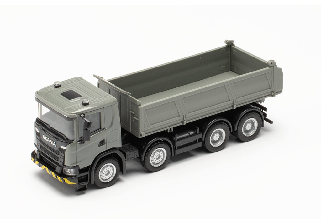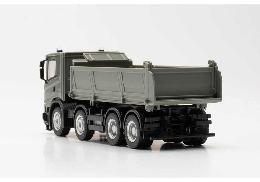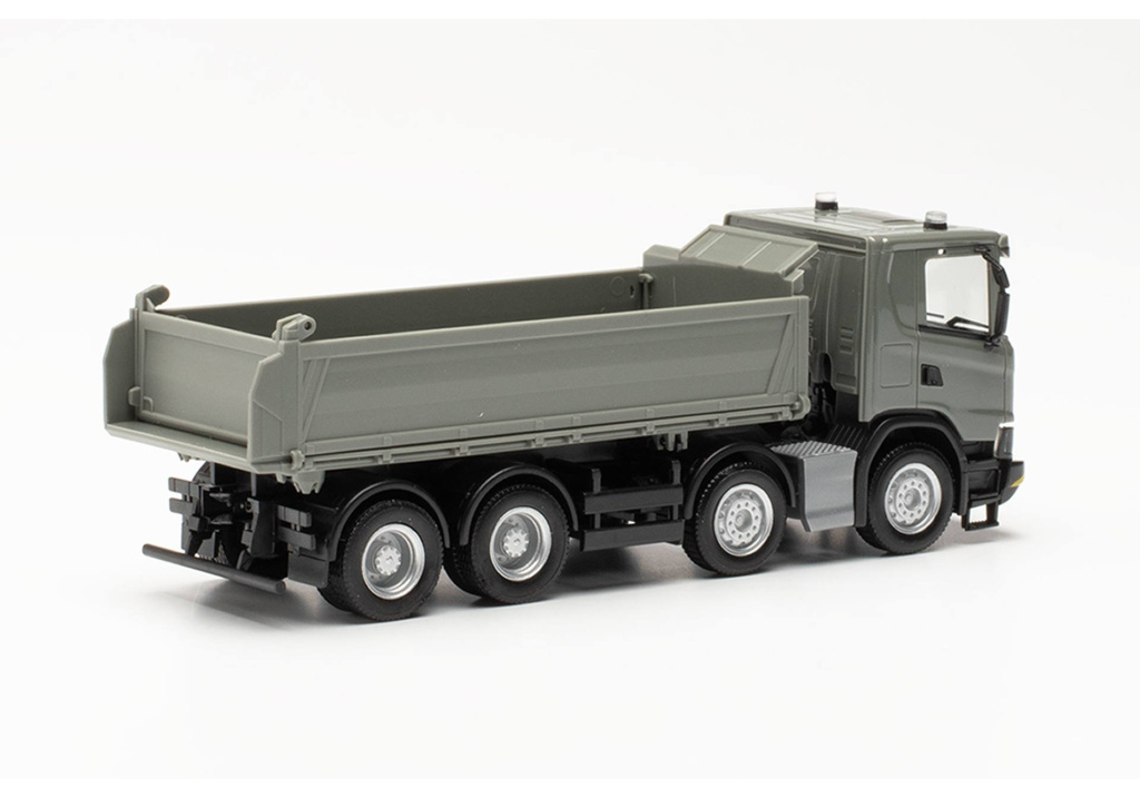 Model čtyřnápravové Scanie CG 17 s pohonem všech kol,jako třístranný sklápěč v šedivém provedení.
