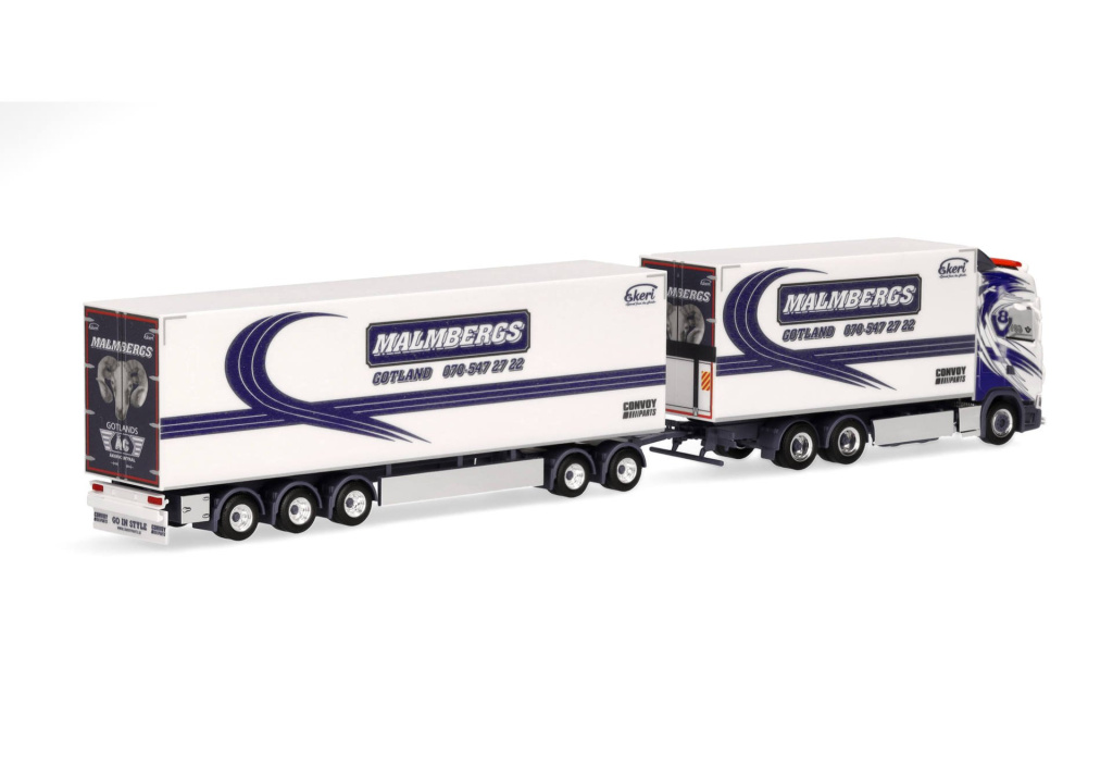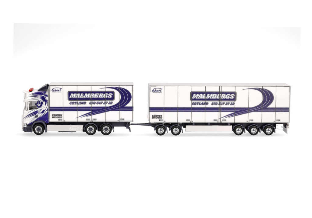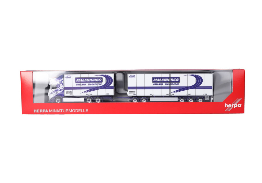 Model nákladní třínápravové Scanie CS 20 HD s pětinápravovým vlekem se skříňovými nástavbami v provedení švédské dopravní společnosti Malmbergs Akeri.