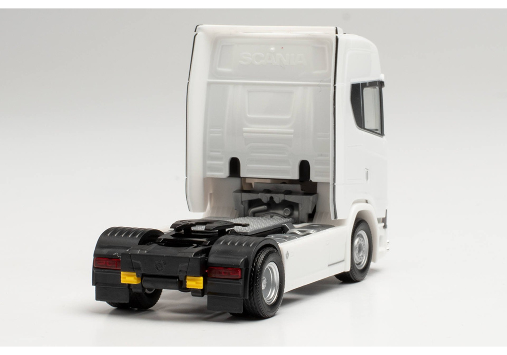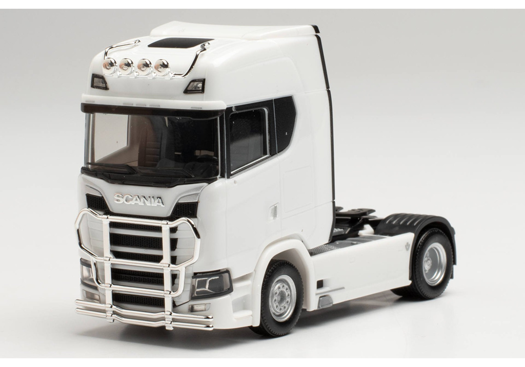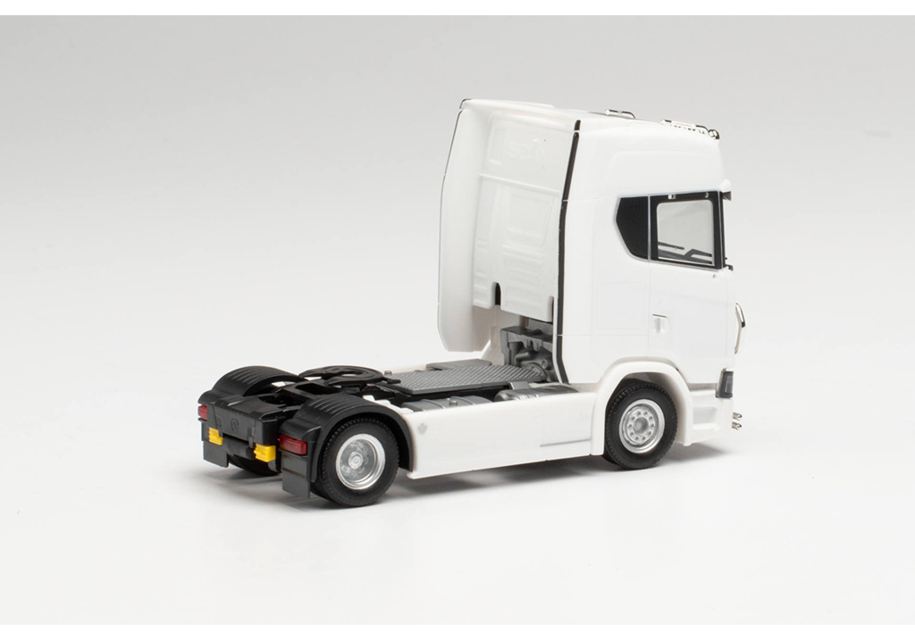 Model dvounápravového tahače Scania CS 20 s vysokou střechou v bílé barvě s chromovanými doplňky.