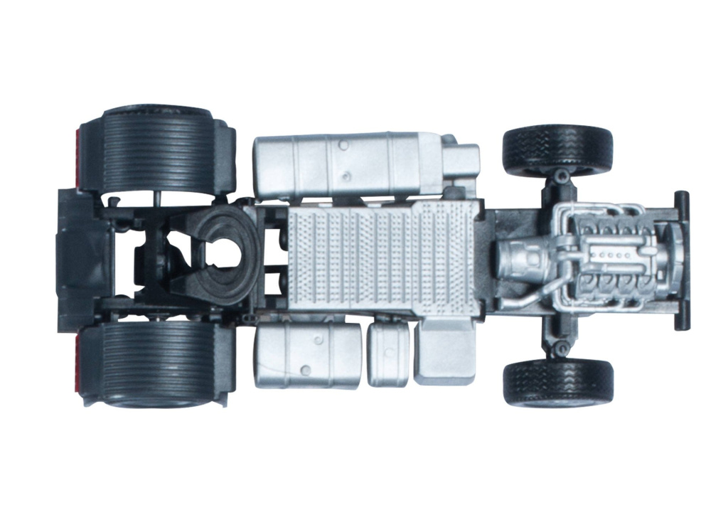 Stavebnice podvozku pro dvoupravový tahač Scania R 13. Podvozek je v černé barvě se stříbrnými doplňky.