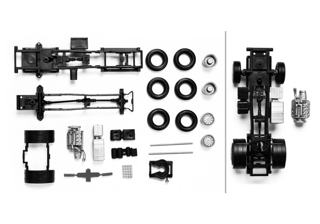 Podvozek pro dvounápravový tahač Scania s pohonem 4x4.Jedno balení obsahuje 2kusy podvozků.