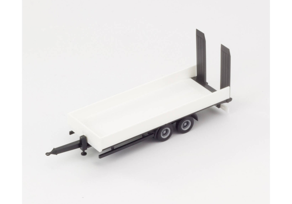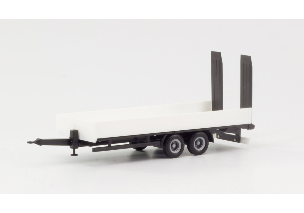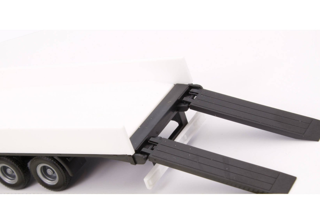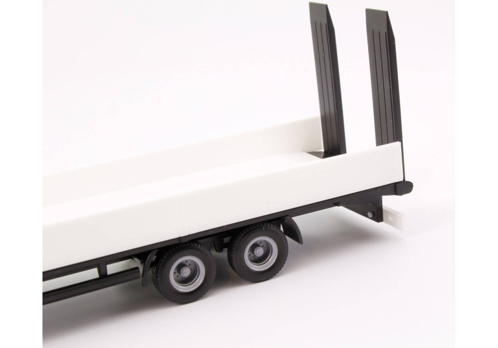 Model dvounápravového tandemového vleku s nízkými bílými postranicemi,s bílou podlahou a funkčními nájezdovými můstky v černé barvě stejně jako je rám.