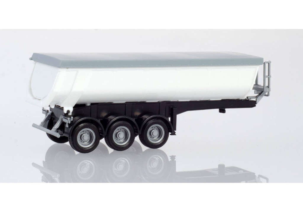 Model třínápravového vanového sklápěcího termonávěsu s horní krycí plachtou,určeného především pro přepravu horkých obalovaných směsí.Rám je v černé,vana v bílé a plachta v šedé barvě.