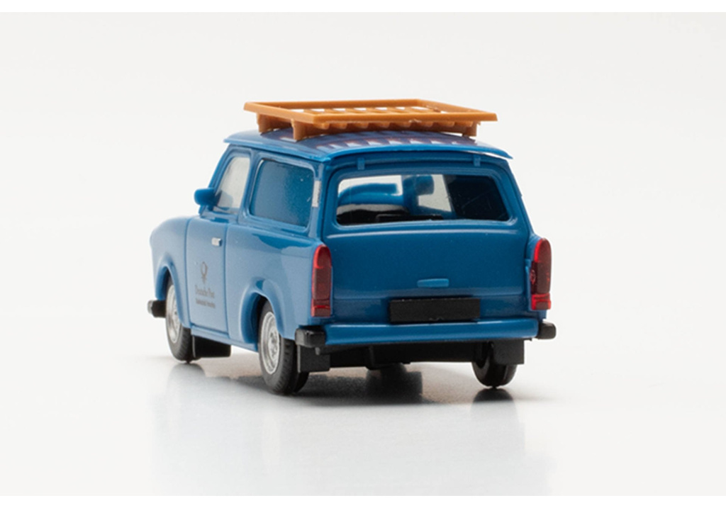 Model osobního automobilu Trabant 601 kombi z produkce bývalé NDR s karosérií v modré barvě se střešním nosičem jako Modrá pošta, jak se divizní studiové technologické televizi v NDR říkalo.