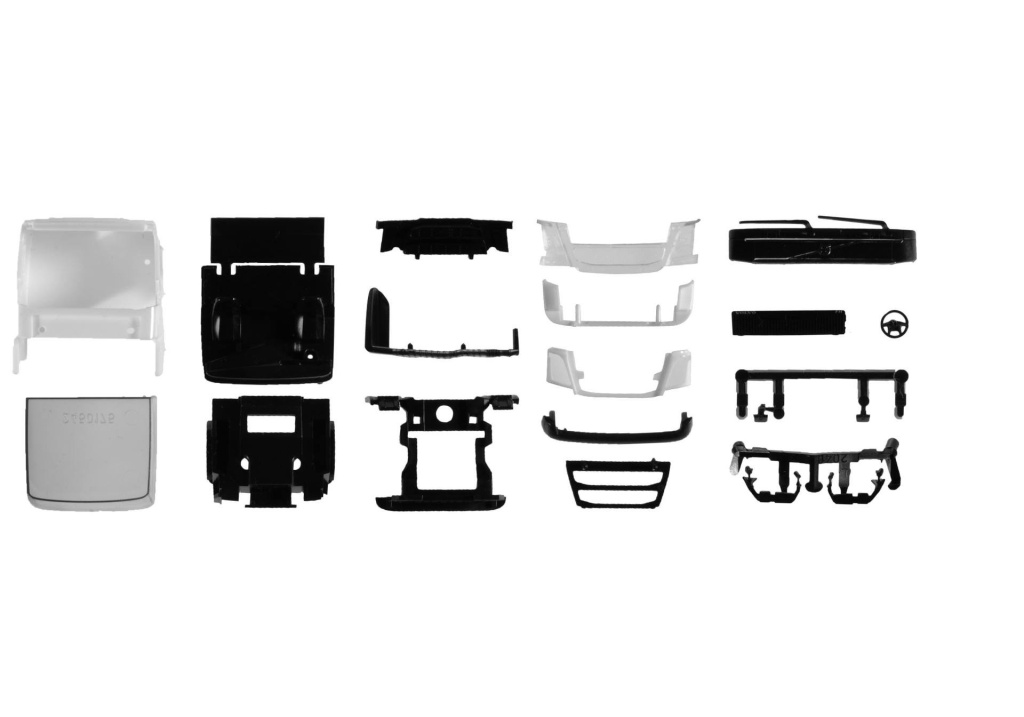 Stavebnice kabiny pro Volvo FH s nízkou střechou,bez bočních deflektorů a bez mezinápravových krytů v bílé barvě.