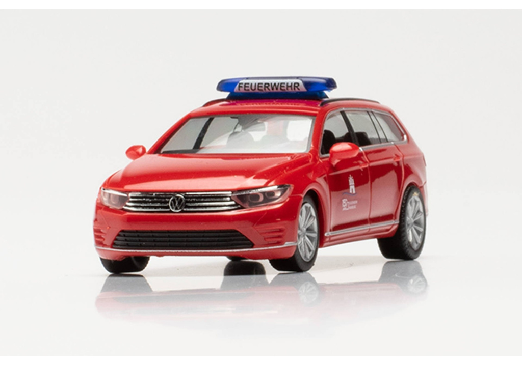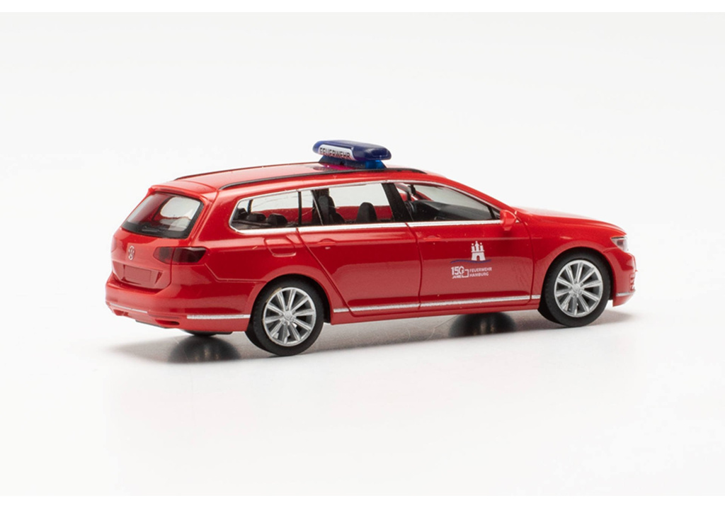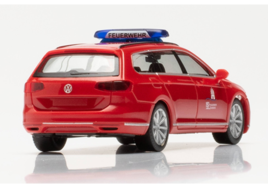 Model osobního automobilu VW Passat Variant GTE barevném provedení hasičského záchranného sboru v Hamburku.V roce 2022 oslavil hamburský hasičský sbor své 150. výročí. Některá vozidla, včetně tohoto hybridního Passatu, dostala na dveře také nálepky s výročím.